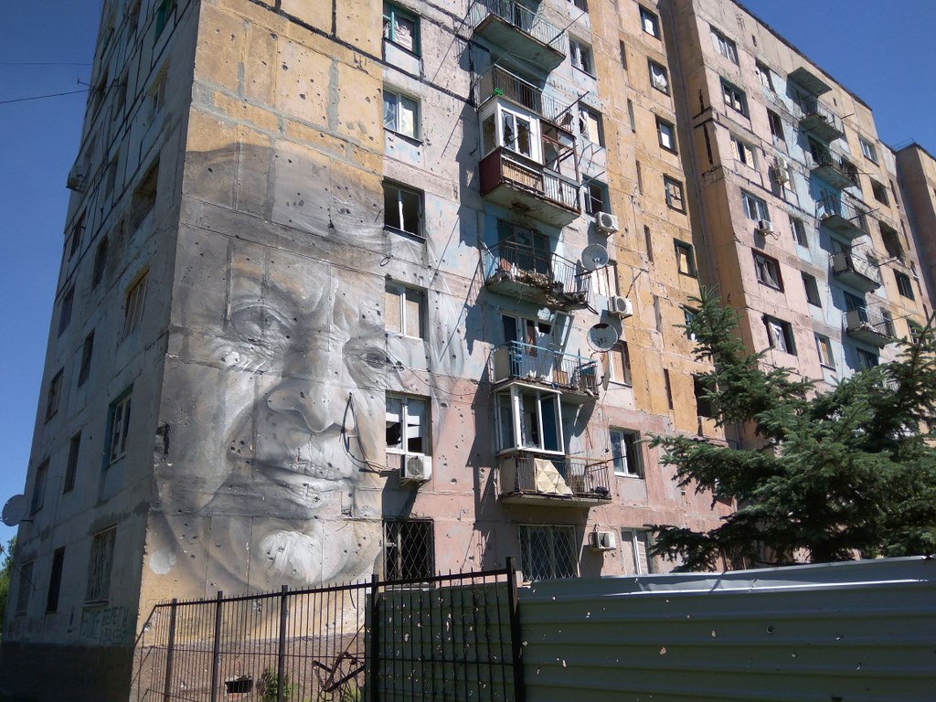 Мого чоловіка поранило неподалік саме того будинку, де потім художник намалював мурал. Цю розгромлену дев’ятиповерхівку в нас називають “разукрашка”, бо під’їзди там були розфарбовані різними кольорами. Снаряди летіли з того боку, куди звернено обличчя на муралі.