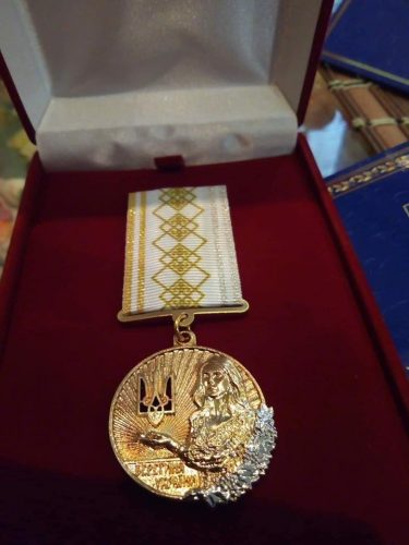 A helmet, brought from the front and painted by Ukrainian artist Maryana Dorichenko, was a present from TWoV and Natalia Prylutska. They also gave the Lithuanian President a “Keeper of Ukraine” badge.