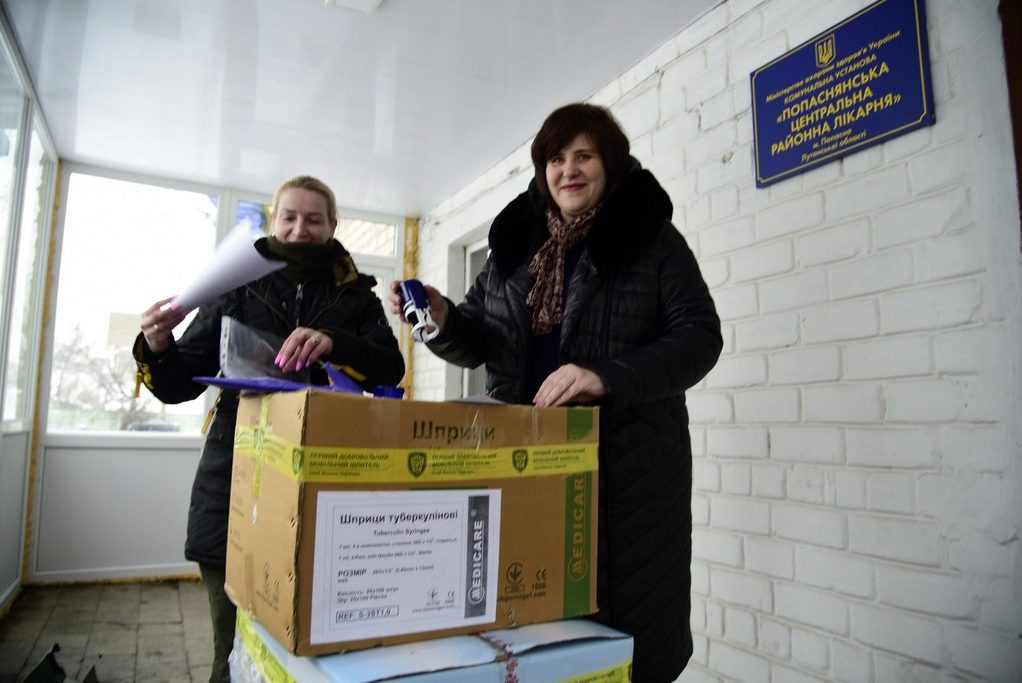 The generous donation, worth nearly half a million hryvnyas, was delivered to Eastern Ukraine by Executive Director of the Charitable Foundation “Pirogov First Volunteer Mobile Hospital” Tamila Danilevska and PFVMH Vice President for Logistics Ihor Buyvol. The vaccine, syringes and tissues were equally divided between the Primary Medical & Sanitary Aid Center in Popasna and the District Territorial Medical Association in Stanytsya Luhanska.