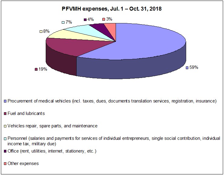 The vehicles clearly take a heavy toll of our revenues: 86% of all expenses over the last four months were to procure, tank up, and repair our medical vehicles, the procurement accounting for the lion’s share at 56%. The costs of personnel (7%) and office (4%) made up just above one-tenth of the total cash spending. “Other expenses” on the chart cover the branded T-shirts that our volunteer medics wear during their missions in Eastern Ukraine, medical expendables, the hosting and domain name for our site, and bank commissions.