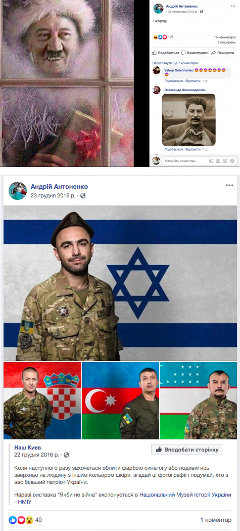 What is the ground for what the defense calls an “absurd statement”? Did they find Mein Kampf in Antonenko’s private library? The “proof” they were able to dig up in the week after the suspicious announcement was a picture of Hitler portrayed as either Santa Claus or Russian Father Frost that Andriy posted on his Facebook – a mere joke probably alluding to the fact that Russian propaganda calls Ukrainian patriots Nazis. Strange, the investigators failed to see another, clearly anti-xenophobic post by Antonenko in 2016 when he allegedly was so “fascinated by ultra-nationalistic ideas, cultivating the greatness of the Aryan race” – photos of Ukrainian soldiers of various ethnic origin standing against the background of respective national flags: Israeli, Croatian, Azerbaijani…