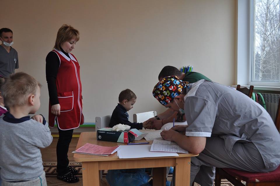 “Приїхали сьогодні о восьмій ранку до Костянтинівки, звідки машиною ПДМШ нас доправили до Попаснянської ЦРЛ, – розповів Сергій Петрик. – Там ми обговорили план дій і вже з одинадцятої розпочали профогляд дітей у садочку. Працювали до четвертої”.