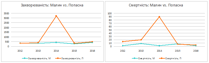 На графіку справа показано, що смертність від цукрового діабету в Попаснянському районі до війни була дещо вищою, але після сплеску 2014 року не просто “повернулася на своє місце”, а в доброму розумінні цього слова “наздогнала” цей показник у Малинському районі.
