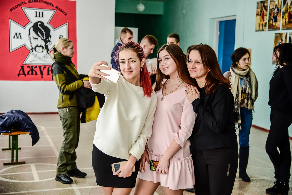 На початку грудня ми поїхали в Одесу презентувати фільм “Кіборги” з В’ячеславом Довженком, який зіграв роль “Серпня”, і Андрієм Шараскіним, бійцем ДУК “Правий сектор”, який був одним з консультантів фільму, а також знявся в ньому в невеличкій ролі. Зазвичай на таких заходах глядачі найбільше фотографуються з В’ячеславом Довженком або режисером, якщо він є. А цього разу я помітила, що хтось інший виявився набагато популярнішим об’єктом для фотографування. Коли придивилася, виявилося, що це – Дмитро Ярош, який прийшов переглянути фільм. (Потім він зізнався, що прийшов до кінотеатру на художній фільм уперше за 20 років.)