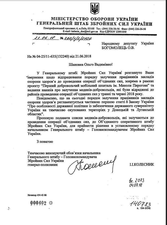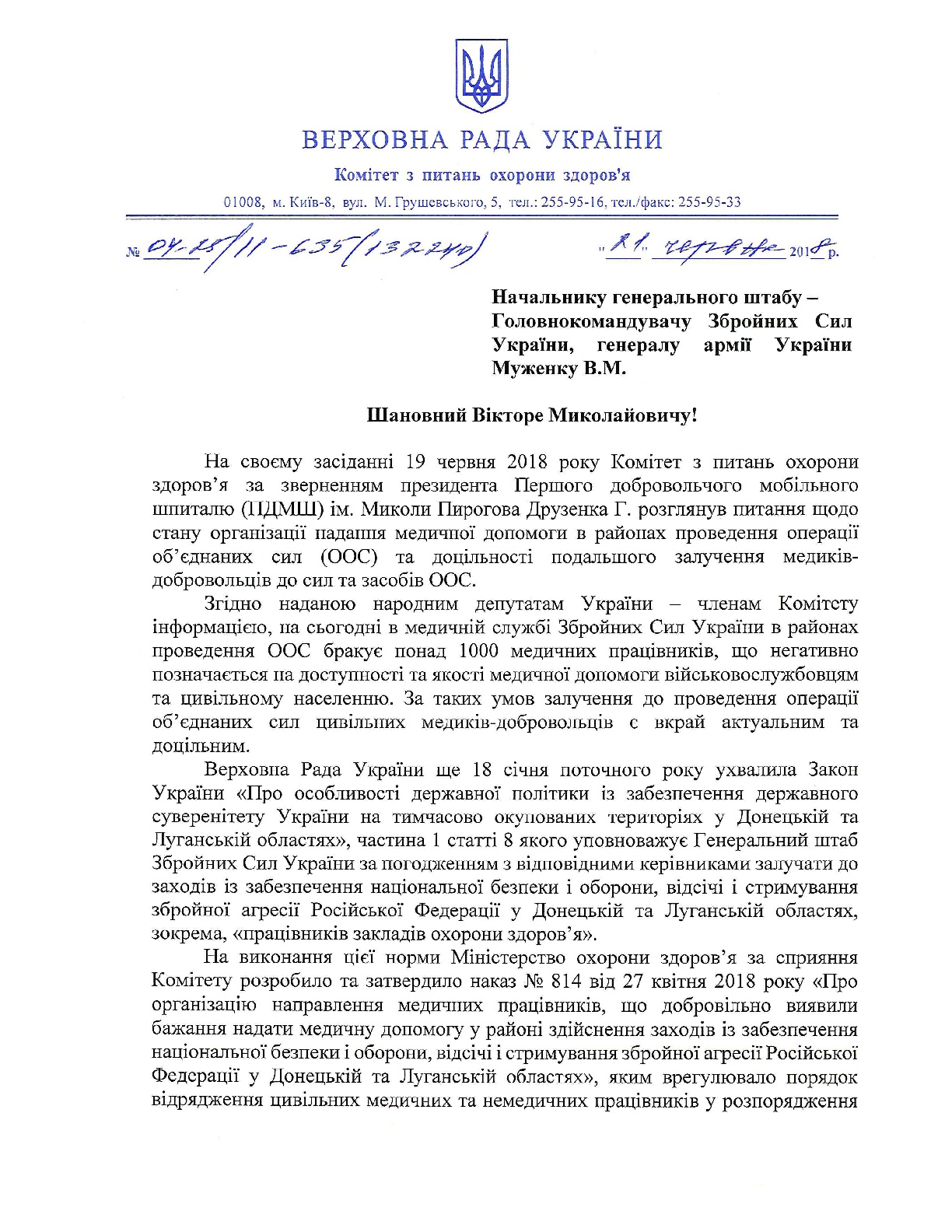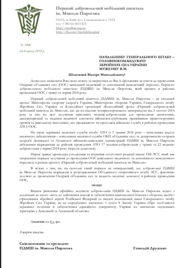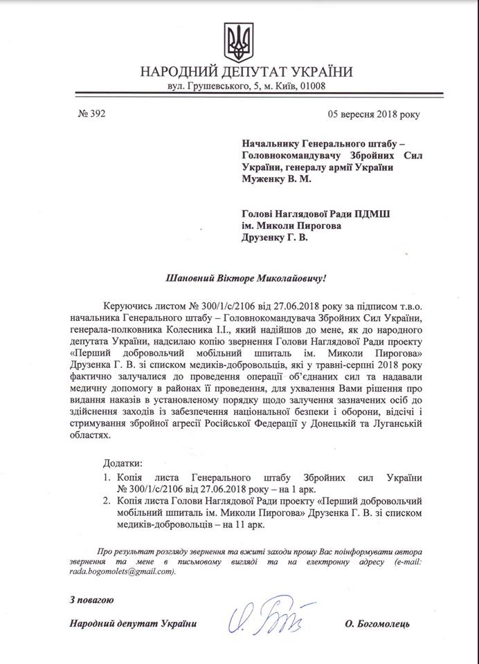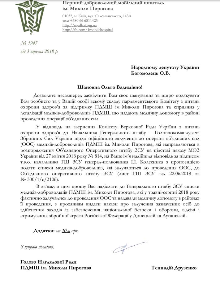Чотири дні тому голова Наглядової Ради Першого добровольчого мобільного шпиталю ім. Миколи Пирогова Геннадій Друзенко надіслав офіційного листа Голові Комітету Верховної Ради України з питань охорони здоров’я Ользі Богомолець. У листі йшлося про прохання переслати до Генерального штабу ЗСУ списки медиків-добровольців ПДМШ, які у травні–серпні цього року були фактично залучені до проведення ООС. Позавчора Ольга Богомолець виконала прохання: надіслала від себе листа Начальнику Генштабу Віктору Муженку і додала ці списки. Людині, незнайомій з передісторією, такий спосіб листування може здатися дивним: чому не надіслати листа до Генштабу безпосередньо?