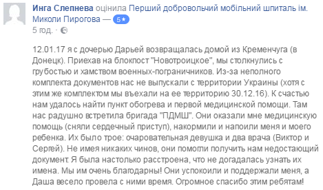 Сьогодні на сторінці Першого добровольчого мобільного шпиталю ім. Миколи Пирогова у Facebook з’явилося сповіщення від мешканки Донецька, в якому вона дякувала бригаді медиків ПДМШ, що працюють у медпункті біля контрольного пункту в’їзду-виїзду “Новотроїцьке” на Донеччині. Інга Слєпньова написала, що учора вона разом з дочкою Дар’єю поверталася додому, але “через неповний комплект документів нас не випускали з території України”. Допомогу – як медичну, так і з отриманням необхідних документів – Інга і Дарина отримали від медиків ПДМШ.