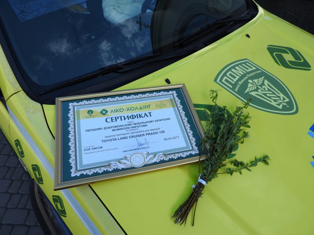 Сьогодні, у Вербну неділю, Перший добровольчий мобільний шпиталь ім. Миколи Пирогова отримав у дар від компанії “Ліко-Холдінг” медико-санітарний автомобіль, придатний для потреб евакуації. Урочиста церемонія передачі та освячення позашляховика Toyota Land Cruiser Prado 120 відбулася біля Спасо-Преображенського собору в Києві одразу після літургії. Від імені компанії ключі та сертифікат на машину президенту ПДМШ Геннадію Друзенку вручив почесний президент” Ліко-Холдінг”, голова Парафіяльної ради та ктитор собору Ігор Лисов.