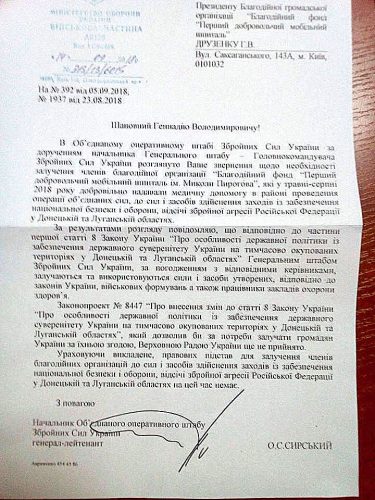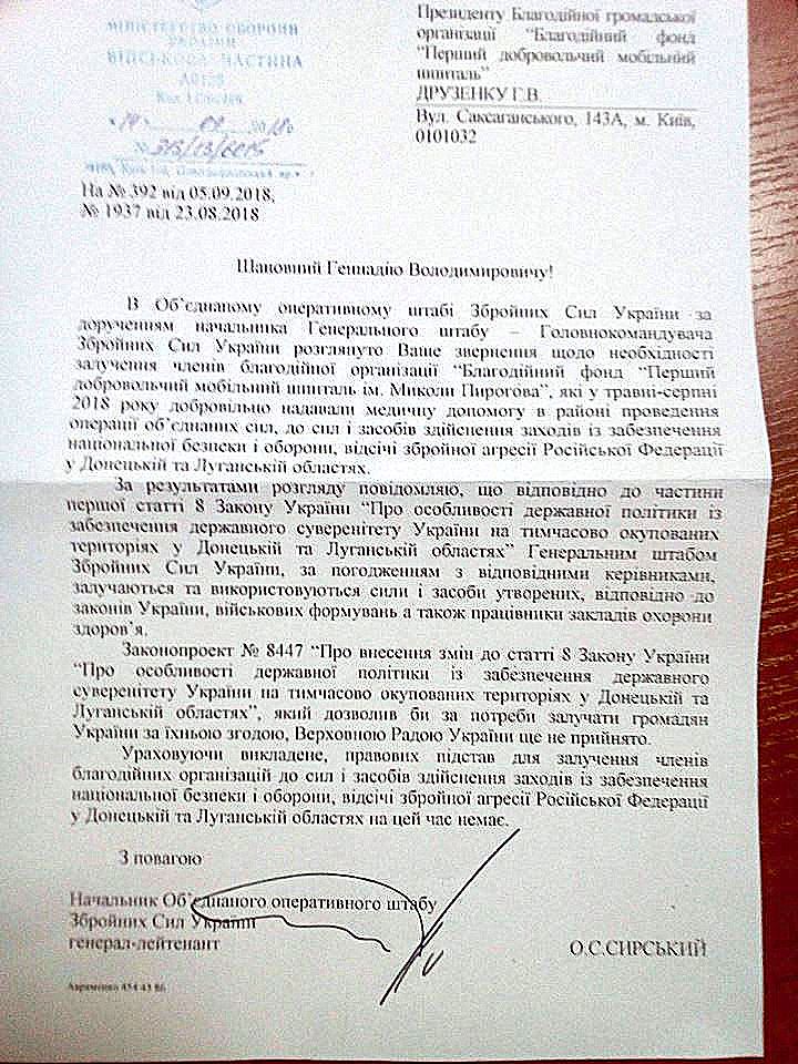 3. Що ж надсилаємо з депутатським зверненням Ольги Богомолець списки медиків-добровольців ПДМШ до Об’єднаного оперативного штабу. Через місяць отримуємо ідіотську відповідь за підписом генерал-лейтената Сирського: мовляв, закон не передбачає можливості залучення до ООС “членів благодійних організацій”.