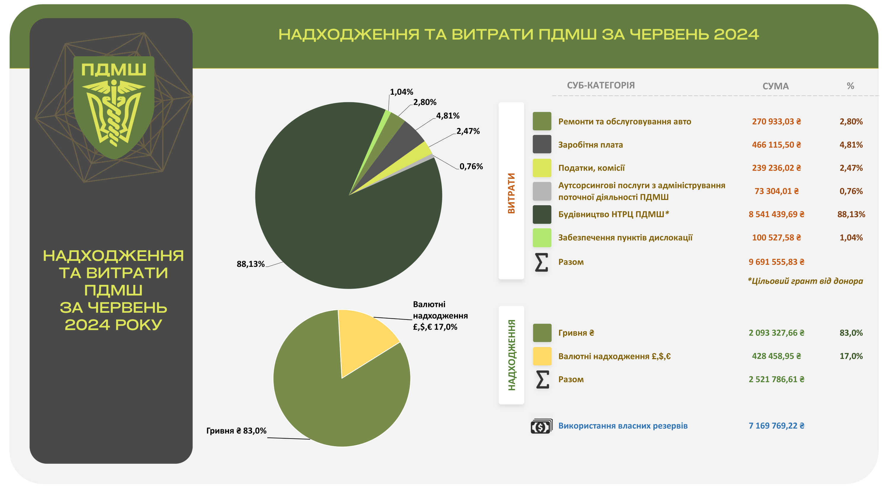Левова частка червневих витрат (9,7 млн грн) припала на будівництво навчально-тренінгового та реабілітаційного центру ПДМШ (8,5 млн грн або 88,13%) за рахунок цільового гранту. Партнери та донори шпиталю також покрили витрати на пальне, через що ця стаття відсутня у червневій структурі витрат.